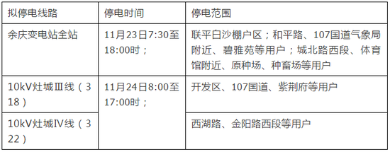 为贯彻市委政府保春节供电精神,保证用户安全可靠用电。我司计划11月23日将对110kV余庆变电站停电消缺,需全站停电;11月24日将对以下线路停电消缺:10kV灶城Ⅲ线(318);10kV灶城Ⅳ线(322)。