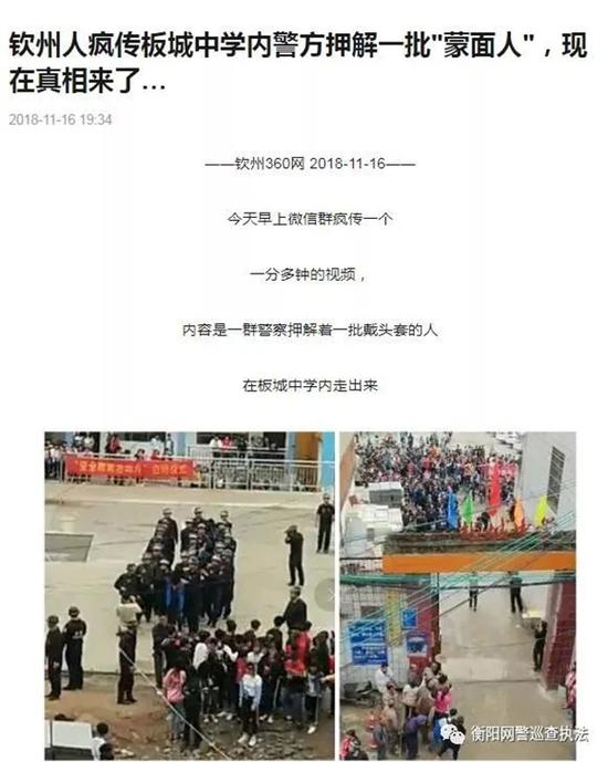 红网12月5日讯 据衡阳市公安局消息,近日,一则视频在抖音、微信朋友圈疯传,视频中,一群警察押解着一批戴头套的人从学校走出来。视频的发布者声称:“祁东步云桥中学8个学生强奸1个女学生并杀死。现全部被抓。”经衡阳网警核实,祁东县公安局最近几天未接到类似警情,该信息中反映情况不属实。视频真相是,11月16日,钦州8名涉案人员对1998年聚众斗殴命案、寻衅滋事等案件进行集中公开辨认作案现场活动。为提高在校学生的法制意识,钦北警方还结合此次公开辨认作案现场活动到板城镇中学开展了法制宣传教育。