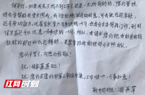 “如果我老了,找不到工作,并且一无所有,到那时你们要帮扶我,我不会拒绝政府的好意。可现在我还年轻,还能干活,请将我的贫困户指标转给那些更需要帮扶的人!”今年6月份,一篇题为《衡阳这封贫困户的来信让所有扶贫人泪目》的稿件在衡阳人的朋友圈被广泛转发点赞。
