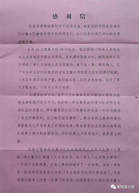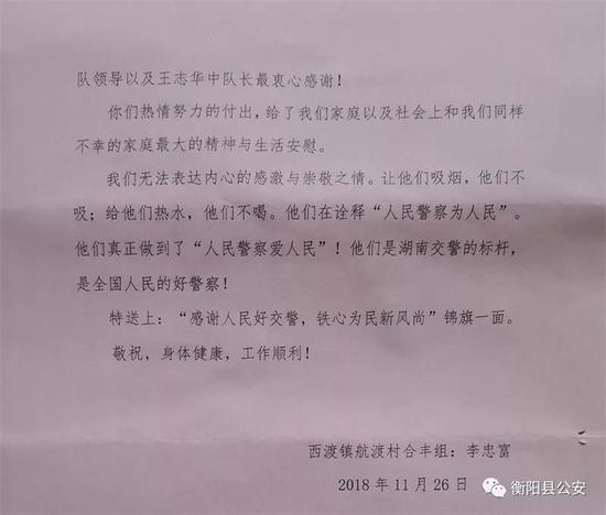 12月10日下午,衡阳县西渡镇航渡村合丰组李忠富侄儿刘辉满怀感激之情来到衡阳县公安局交警大队事故中队,将一面印着“感谢人民好警察,铁心为民新风尚”的锦旗和一封感谢信送到了中队长王志华手中,以表达对交警努力为事故当事人着想,帮助当事人度过难关的感谢之情。