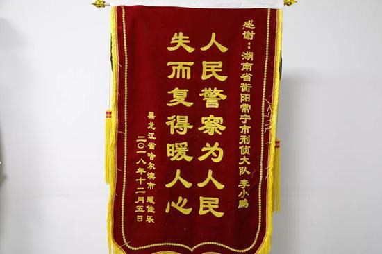 近日,常宁市公安局刑侦大队民警收到一个来自黑龙江省哈尔滨市的快递,打开一看,原来是一副写着“人民警察为人民,失而复得暖人心,感谢常宁市公安局刑侦大队民警李小鹏”的鲜红锦旗,落款人是黑龙江省哈尔滨市的藏佳乐。