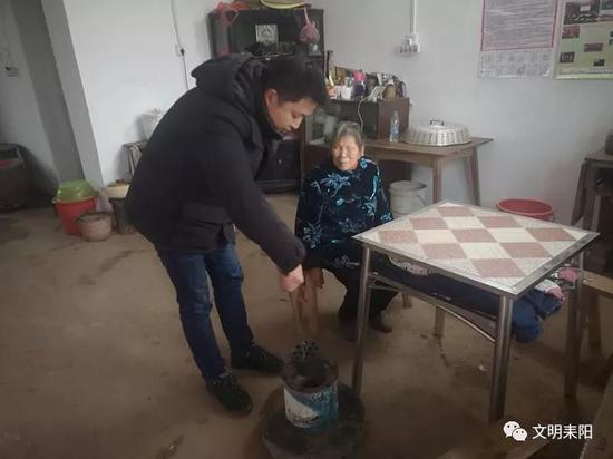 “是杨队长吗?快点进屋来烤烤火……”12月16日一大早,耒阳市大和圩乡雅江村盲人阿婆徐桂英一听到熟悉的脚步声便迎声问道。驻雅江村扶贫队第一书记杨军忙进屋扶她坐下,顺便把“奄奄一息”的煤球换好后,才不慌不忙地和徐桂英围在火炉旁,把刚领的小龙虾养殖合作社分红600元递给徐桂英。