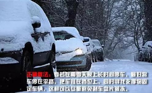 通常人们在停车的时候都会拉上手刹,以防汽车溜车。可就是这么一个看似安全的动作,在雨雪天晚上却不能随意使用。因为,在雨雪天行驶后,刹车盘片上通常都会有雪水,如果晚上停车的时候拉上手刹,则刹车盘片就可能会被冻住。所以,车主如果在雨雪天晚上长时间停车的话,最好将车停在平路上,然后将车挂在档位上, 同时寻找支撑物固定车辆,这样既可以尽量避免刹车盘片被冻同时也能避免车辆溜车。