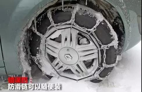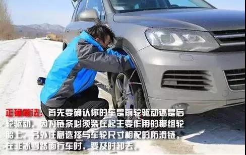 正确做法:首先要确认你的车是前轮驱动还是后轮驱动,因为链条必须装在起主要作用的那组轮胎上。尤其是自动挡车应注意,在两个前轮(后轮)上同时装上防滑链,不要只在一个车轮上使用防滑链,这样很容易损坏自动挡变速箱。此外,防滑链也有尺寸限制,分别适合不同的轮毂尺寸和胎宽,注意选择与车轮尺寸相配的防滑链。安装防 滑链后,行驶速度一般不要超过每小时50公里,行车时,避免急刹车、急前进、急转弯和连续空转的行为。