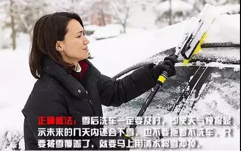 正确做法:雪后洗车一定要及时,即使天气预报显示未来的几天内还会下雪,也不要拖着不洗车。此外,露天洗车辆时,清水很容易灌进锁眼,这时因雪后天气寒冷,特别容易把锁芯冻住。因此洗车前,最好能用胶布把锁眼贴住,以防止进水。用洗车机洗车,水雾均匀,门被冻住的机会比较少。如果冻住了,用打火机把钥匙烧一下,就可以 很容易地把冻住的车锁打开。