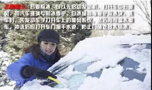 正确做法:如果不想每天一早起来就看到难清理的冰雪,车主可以在每天用完车以后,不立即锁车走人,而是将两侧门打开通风,等车内的温度降至与车外差不多的时候,打开电源,用雨刷器将挡风玻璃上残留的雪水刷干净,这时再关上车门,锁好车。这样,第二天早晨挡风玻璃上通常就不会有冰,只有雪,车主只要清扫积雪就可以。