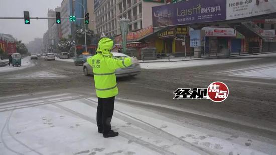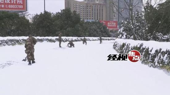 岳阳市琵琶王立交桥道路结冰严重,已无法通行,武警湖南总队岳阳支队官兵抵达现场时,积雪达20余厘米。
