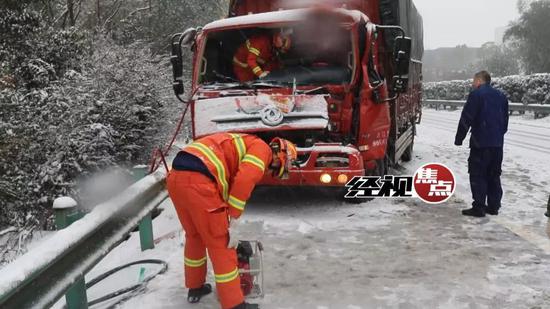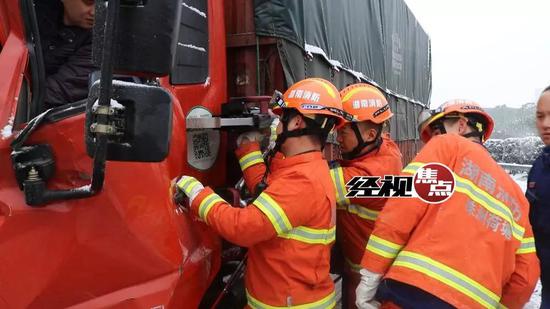 在湖南株洲沪昆高速株洲段东往西方向1042公里处,由于发生交通事故,导致1辆大货车驾驶室变形,驾驶员被困。