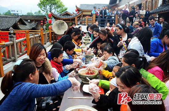正逢母亲节,火宫殿特设总长达百米的“龙虾长龙宴”,款待来自各国的母亲们。当日还进行了剥虾比赛、龙虾摆盘比赛,三棒鼓、打溜子、桑植民歌、摆手舞等非遗文化也亮相现场,热闹非凡。