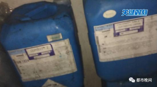 在每个浸泡红毛丹水泥的旁边,都放着十多个蓝色的塑料桶,上面写着“蓄电池补充液”(放大特写,重音),而且每个桶上标注了警告:“吞咽可能有害,溅到眼睛或皮肤上会引起损伤”。