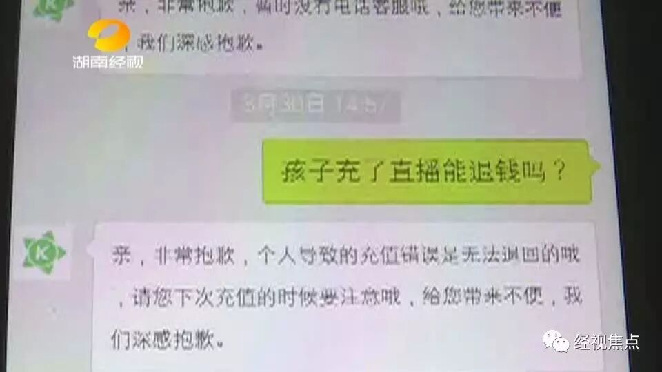 因为酷狗直播公司没有客服电话,尹女士在网上联系到了酷狗直播的客服。但是客服表示孩子充了钱是无法退回的。