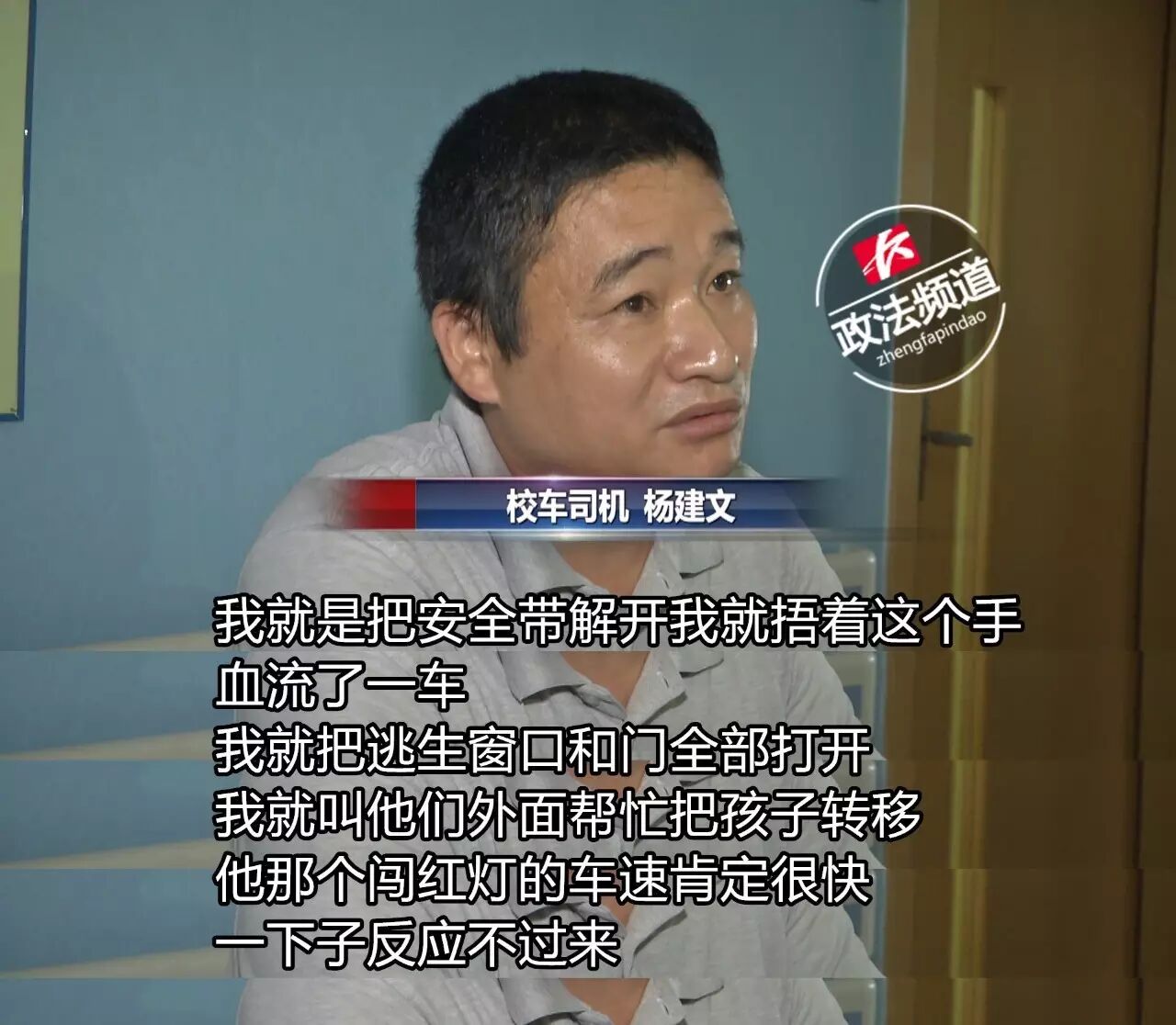 在医院内,记者也见到了校车司机杨师傅。他回忆,事发时,他处于正常行驶状态,突然,一辆越野车闯红灯撞了上来,校车侧翻倒地。