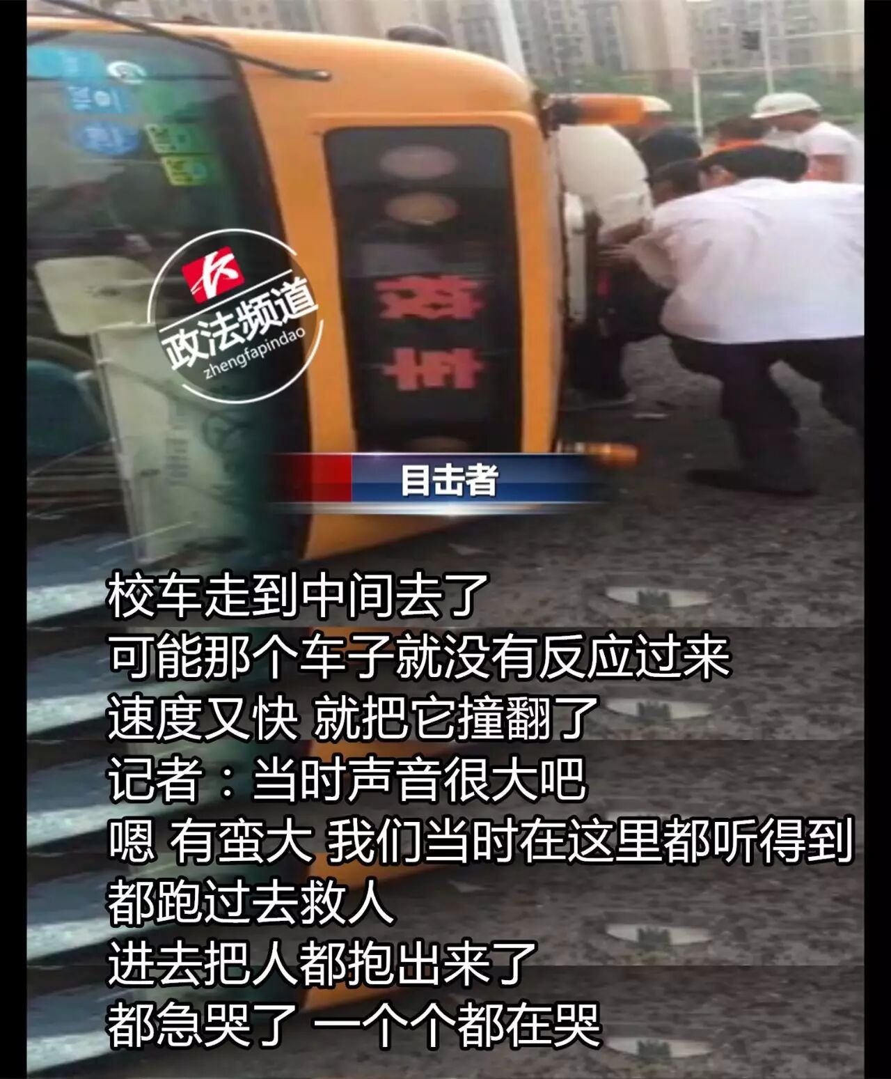 ▲据目击者介绍当时校车由东往西行驶时被一辆由北往南的越野车撞翻。