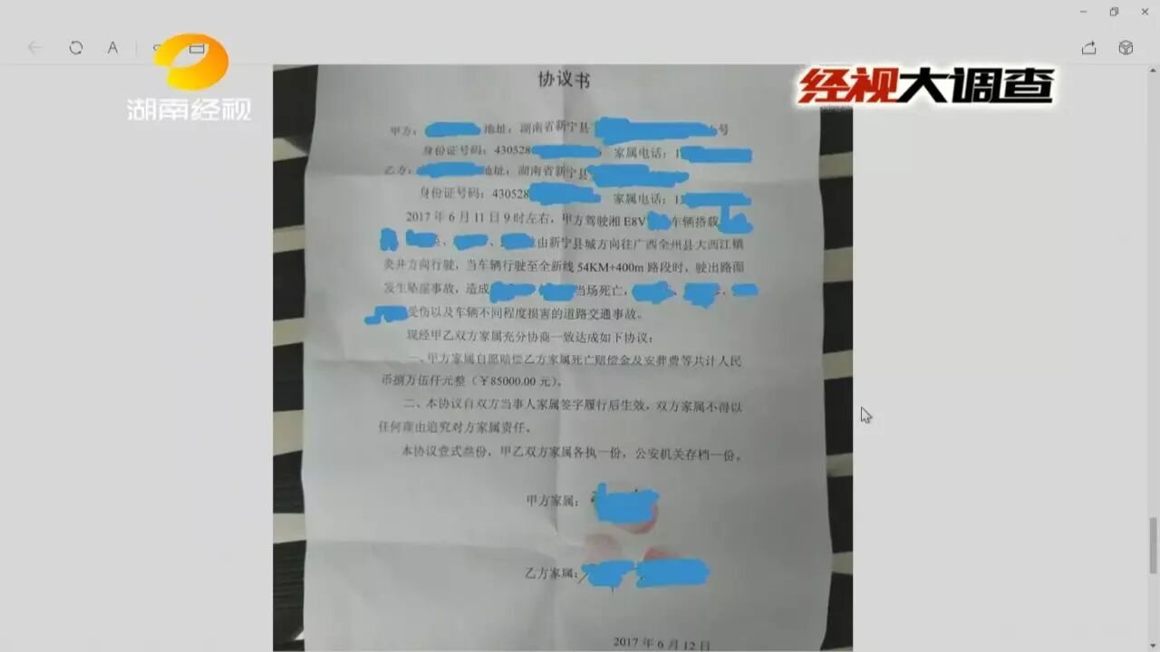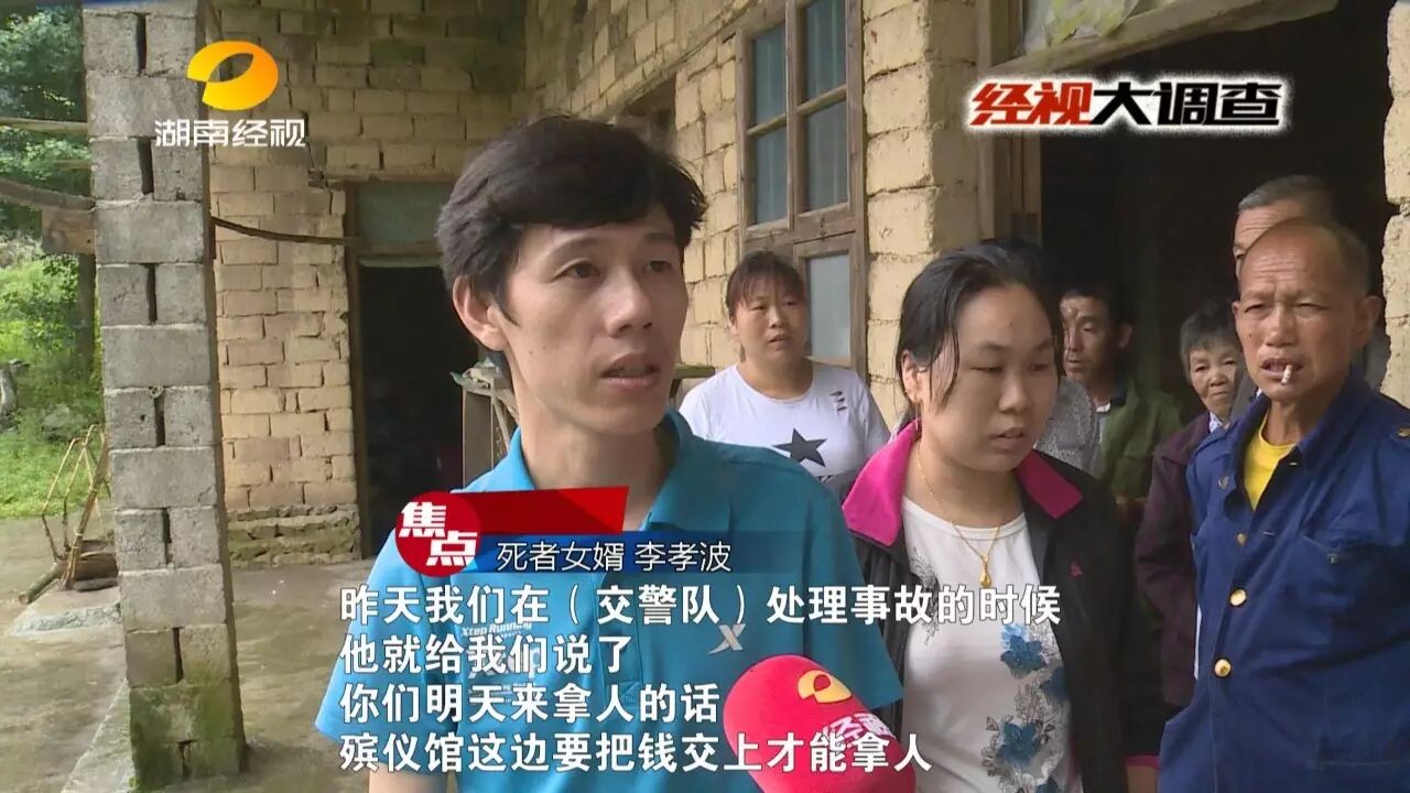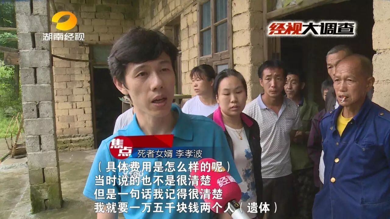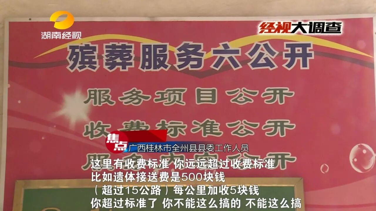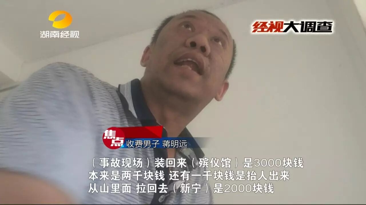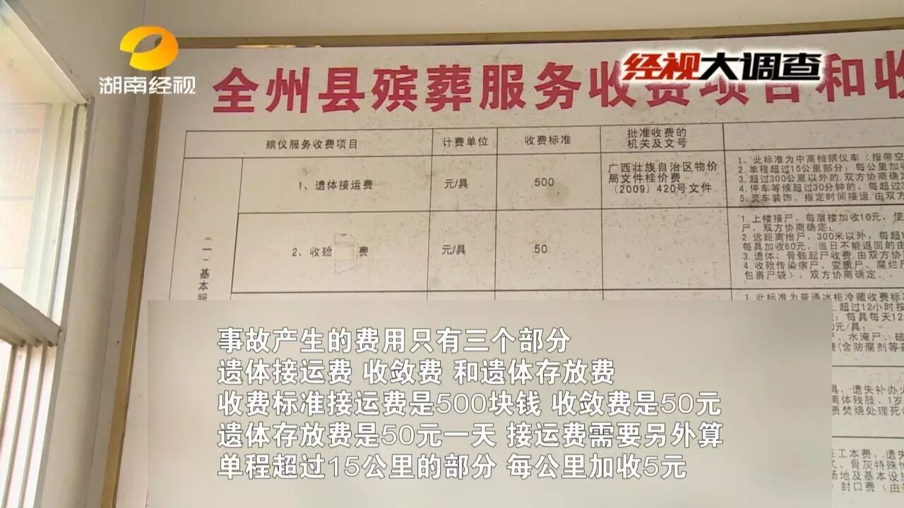 邵阳新宁的一辆小车,前段时间在临近的广西全州县发生翻车事故,车上五人中,司机和一位后排乘客不幸当场身亡。广西全州县交警处理了这起事故,可接下来却发生了一件让死者家属寒心又愤怒的事,死者家属来到相距不到100公里的广西全州县境内,想要运回遗体,没想到竟然被索要15000元,第二天更涨价到16800元,不给钱就不给遗体,而且还不开任何票据。是谁要收取这天价运尸费?又是谁在挟尸要价,把遇难者的遗体当做筹码呢?来看记者的调查。