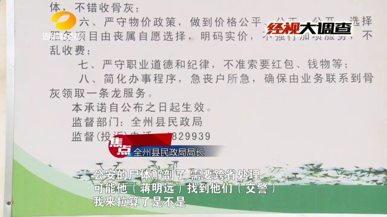 明目张胆的乱收费,真是狂妄至极!记者随后将此事反映到全州县委县政府,县政府高度重视,经过初步清算,整个运送遗体过程所发生的费用每人只有2000元,两具加起来也只要4000元,而蒋姓男子收取的16800元,超过了收费标准的四倍!