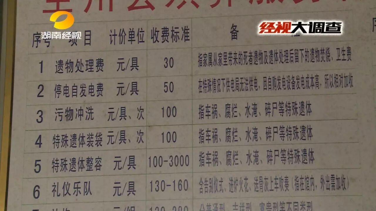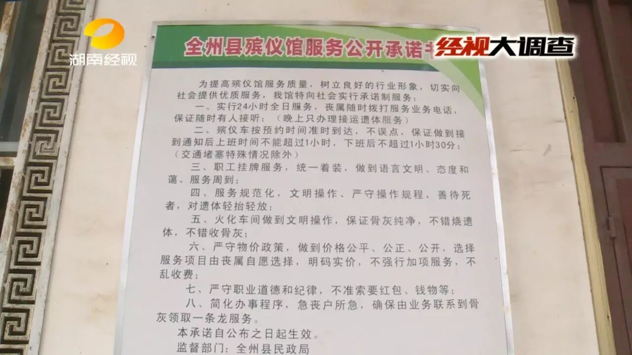 在全州县殡仪馆业务大厅内,有关收费已经全部公示在墙上,遗体带和卫生费都只要100元钱。