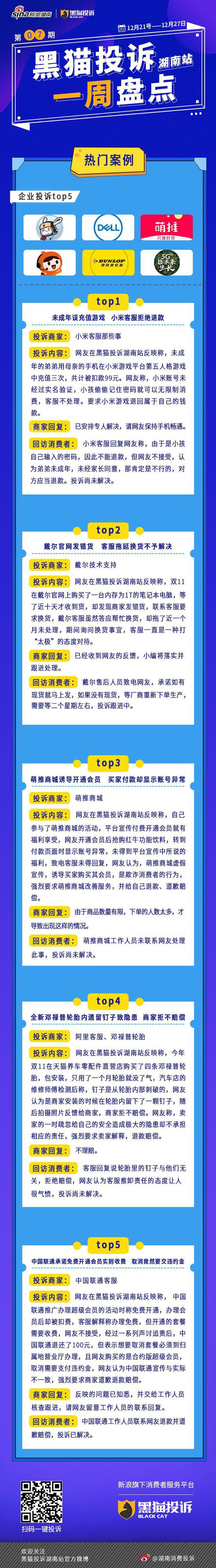未成年误充值游戏 小米客服拒绝退款;戴尔官网发错货 客服拖延换货不予解决;萌推商城诱导开通会员 买家付款却显示账号异常;全新邓禄普轮胎内遗留钉子致隐患 商家拒不赔偿;中国联通承诺免费开通会员实则收费 取消竟然要交违约金;……本周湖南消费维权联盟投诉TOP企业为@小米客服那些事 @戴尔技术支持 @萌推商城 @阿里客服 @邓禄普轮胎 @中国联通客服 更多详情戳下图↓↓↓ 守护湖南人的消费权益。