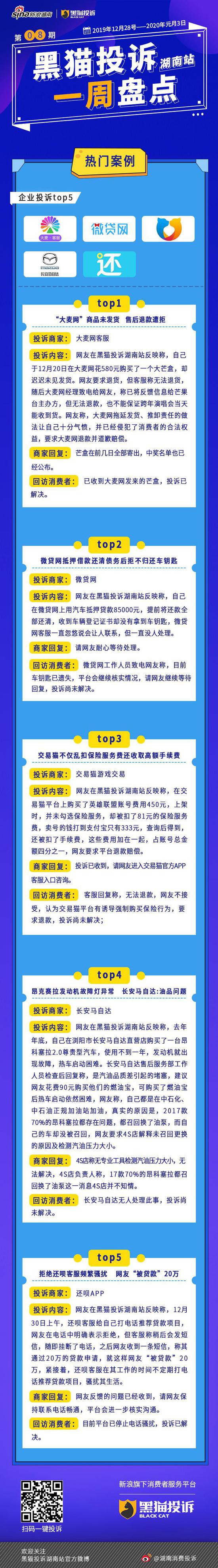 “大麦网”商品未发货 售后退款遭拒;微贷网抵押借款还清债务后拒不归还车钥匙; 交易猫不仅乱扣保险服务费还收取高额手续费;昂克赛拉发动机故障灯异常 长安马自达:油品问题;拒绝还呗客服频繁骚扰 网友“被贷款”20万;……本周湖南消费维权联盟投诉TOP企业为@大麦网客服、@微贷网、@交易猫游戏交易、@长安马自达、@还呗APP 更多详情戳下图↓↓↓ 守护湖南人的消费权益。