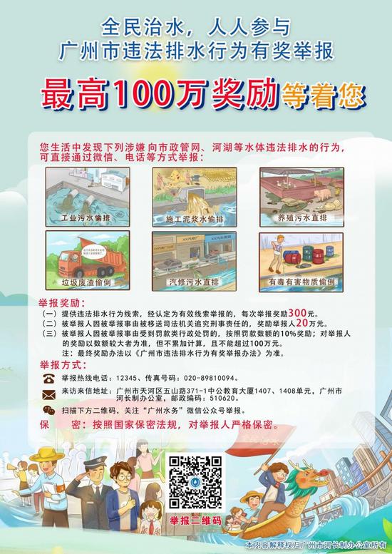 2017年9月27日,为严厉打击违法排水行为,扭转排水户违法排水现象恶化趋势,鼓励单位和个人积极参与黑臭水体治理工作,《广州市违法排水行为有奖举报办法》经市政府审定同意正式印发施行。《办法》规定了5类违法排水行为纳入举报有奖范围,主要包括向河道、湖泊、水库、市政管网等倾倒垃圾、粪便、废渣、施工泥浆水、建筑废弃物、排放生活污水、工业废水等。只要被认定为有效线索,每次举报最低奖励300元;被举报人因被举报事由被移送司法机关追究刑事责任并受到罚款类行政处罚的,举报人最高可获得100万元奖励!