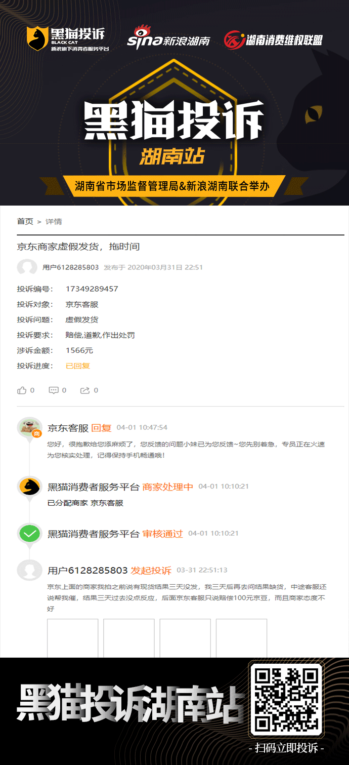 4月1日,@京东客服 在湖南湖南消费维权联盟回复网友:“您反馈的问题小妹已为您反馈~您先别着急,专员正在火速为您核实处理,记得保持手机畅通哦!”