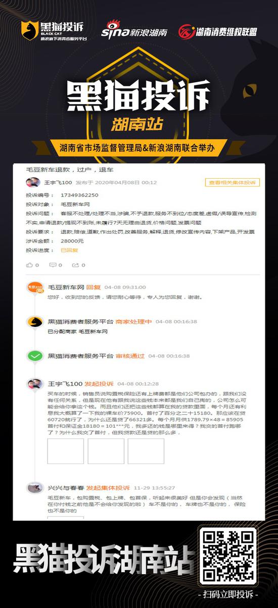 4月8日上午9点31分,@毛豆新车网 在湖南消费维权联盟回复称,会安排专人处理。后续进展,我们将持续关注,投诉详情: