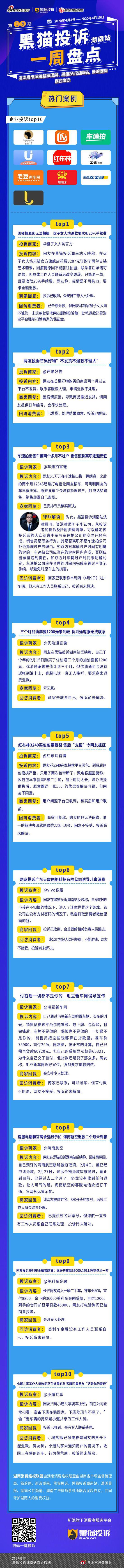 因疫情原因无法拍摄 盘子女人坊退款要求扣20%手续费;车速拍出售车辆两个多月不过户 销售谎称离职逃避责任;收了货款近2个月不发货 芒果好物客服不理人;三个月加油套餐1200元未到帐 优油通客服无法联系......本周湖南消费维权联盟投诉TOP企业为@盘子女人坊官方、@芒果好物、@车速拍官微、@优油通官微、@红布岭官博、@vivo客服、@毛豆新车网、@海南航空、@美利车金融、@小遛共享,更多详情戳下图↓↓↓ 守护湖南人的消费权益。