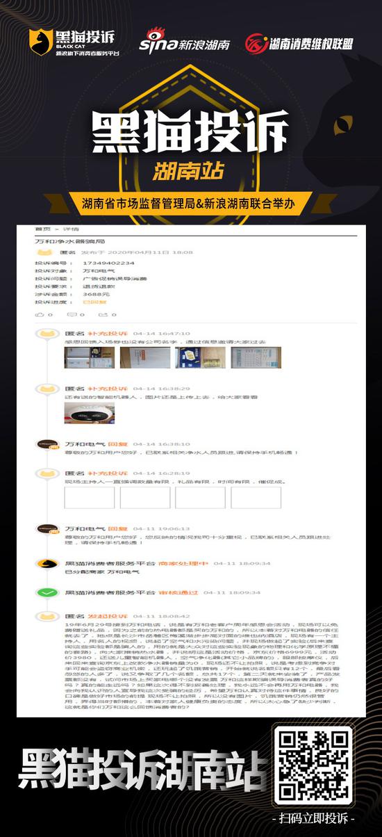 4月14日下午16点38分,@万和电气 在湖南消费维权联盟回复称,己联系相关净水人员跟进,请网友保持手机畅通。后续进展,我们将持续关注,投诉详情: