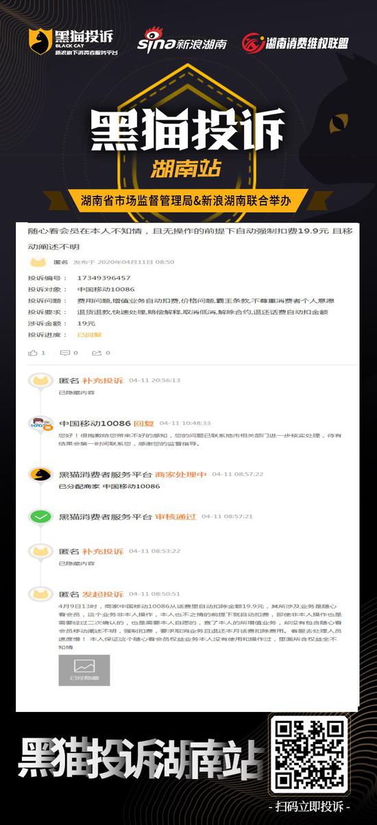 4月11日,@中国移动10086 在湖南消费维权联盟回复称,网友反馈的问题已联系地市相关部门进一步核实处理,请网友耐心等 待。