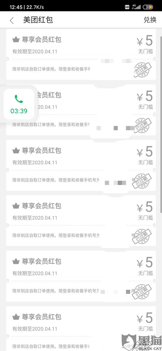 4月17日,网友在湖南消费维权联盟反映称,自己在美团平台有12张会员红包,因疫情原因,本地无外卖服务,导致红包过期,致电美团客服回复称,平台没有相关延期通知无法延期,也无补偿。