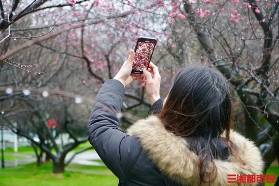 三湘都市报2月17日讯(实习生 黄诗淇 周蔚 摄)2月17日,长沙下着小雨,橘子洲头梅园的梅花在雨中盛开,红的白的争奇斗艳,带来早春的气息,淡淡的梅花香味引得游客们驻足拍照,雨中赏梅也别有一番风味。