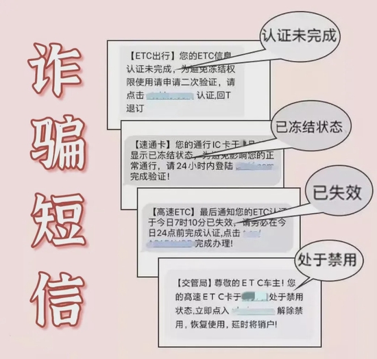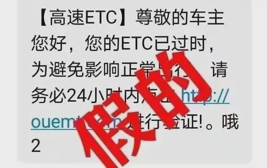 短信内容会提及:“ETC过期认证、失效激活”或者“医保停用、失效”等信息,并附带网页链接,诱骗事主点击链接,在网上“认证激活”。