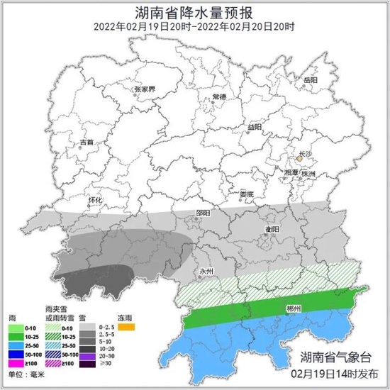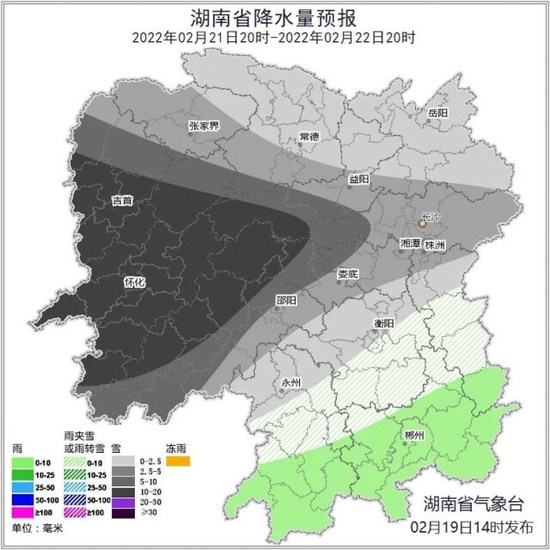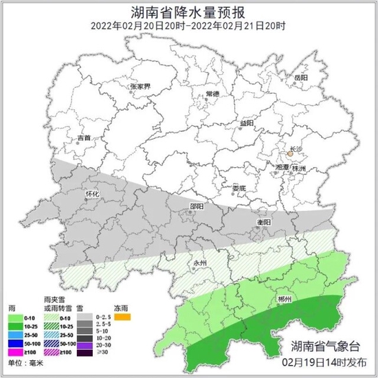 19日20时至20日20时,湘中偏南阴天有小雪或雨夹雪,其中怀化南部、邵阳南部局地中到大雪,永州中南部、郴州阴天有中到大雨,其他地区阴天到多云;湘西南高海拔地区有冻雨,湘北早晨局地有雾;北风3~4级减小到2~3级;最高气温湘北5~7℃,其他地区3~5℃;最低气温0~2℃。