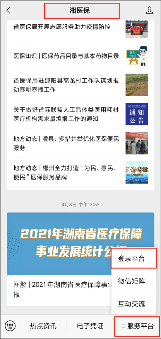 一、手机微信搜索关注微信公众号“湘医保”,点击右下方菜单按钮“服务平台”的“登录平台”进入“湘医保服务平台”页面。
