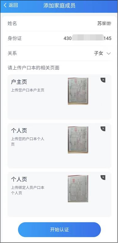 六、户口簿信息上传完毕后,点击[开始认证],通过后家庭成员绑定成功