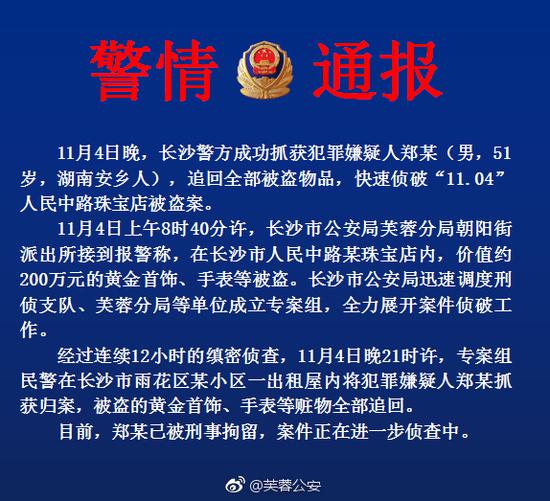 11月4日晚,长沙警方成功抓获犯罪嫌疑人郑某(男,51岁,湖南安乡人),追回全部被盗物品,快速侦破“11.04”人民中路珠宝店被盗案。