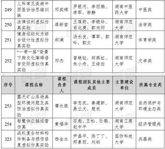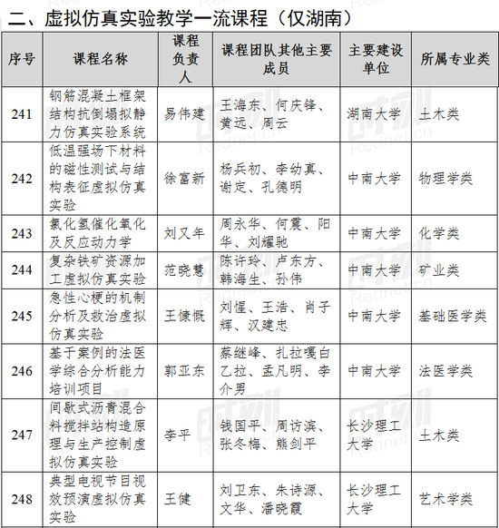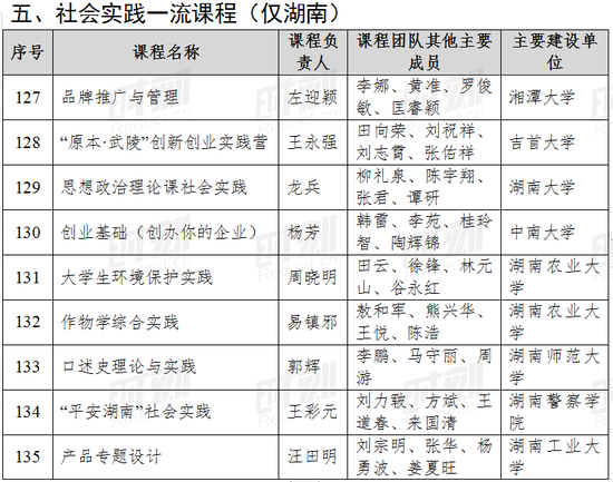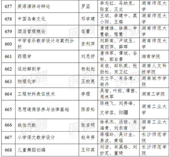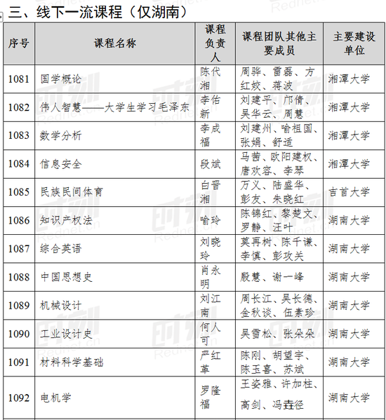 10月29日,教育部高等教育司发布了《关于首批国家级一流本科课程认定结果的公示》,拟认定3560门课程为首批国家级一流本科课程。其中,线上一流课程717门,虚拟仿真实验教学一流课程327门,线下一流课程1464门,线上线下混合式一流课程868门,社会实践一流课程184门。湖南大学、中南大学、湖南师范大学、国防科技大学、湖南农业大学等27所湖南高校的专业课程入选。