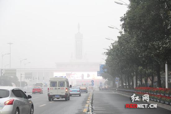 (今天上午十时,几百米外的长沙火车站在雾霾中若隐若现,“长沙”二字难以辨清。)