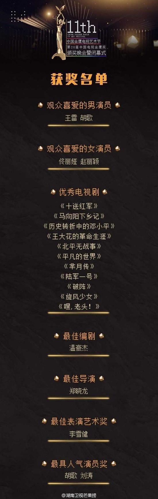 16日,第28届中国电视金鹰奖暨第11届中国金鹰电视艺术节颁奖晚会在长沙举行,各项大奖均揭开神秘面纱。