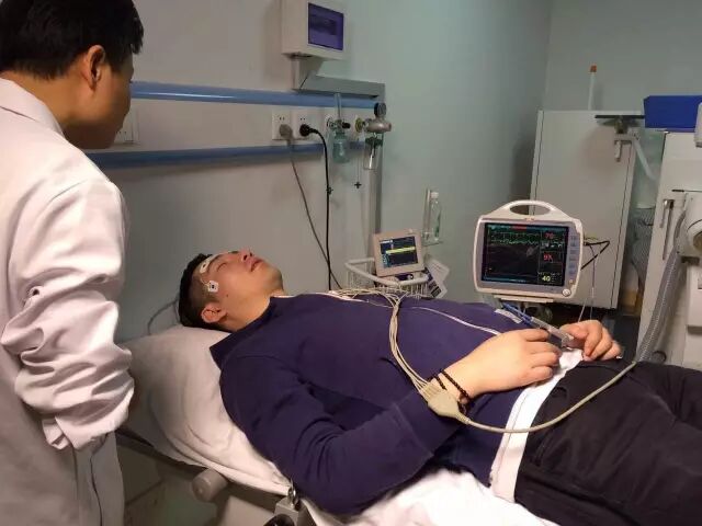 我们找到了杭州市一医院麻醉科孙建良主任来监控。试验开始前,医生先给记者头上安装了脑电频谱监测仪,用来测试人的脑电活动状态,这是麻醉医生用于观察病人是不是睡着了。一般,脑电频谱状态是92 是正常的,清醒状态是90到100之间,又给记者做了血压、心电图、血氧饱和度的检测,这些数据指标,将可以观察吸入笑气的记者的脑电和生命体征变化情况。