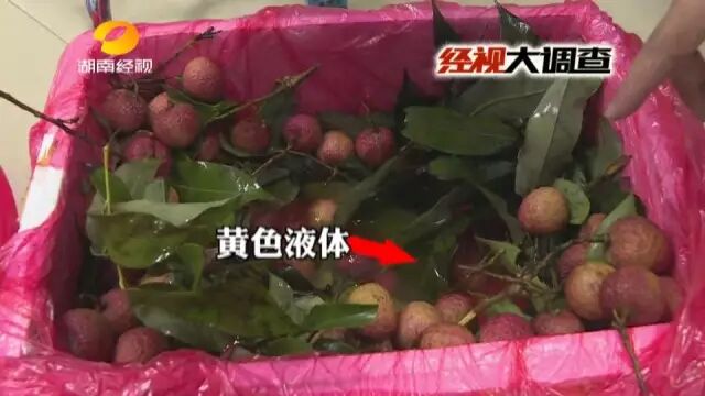而在另一家商店内,记者也发现装满荔枝的箱子里,有不少黄色的液体。