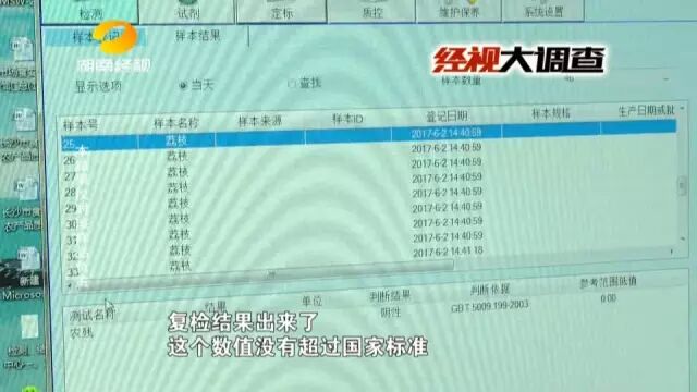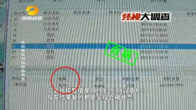 结果显示,记者所购买的5份荔枝样品中,3份没有检出二氧化硫,2份荔枝中的二氧化硫含量分别为16和19毫克每公斤,水份中为1.13毫克每公斤。