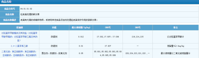 经查询《食品安全国家标准 食品添加剂使用标准》 (GB2760-2014,2015年5月24日正式实施),经表面处理的鲜水果中,二氧化硫残留量为0.05克每公斤,即50毫克每公斤。“经表面处理的鲜水果”解释是,表面有光滑的或蜡样物质,或使用其他食品添加剂处理起表面保护作用的新鲜水果。