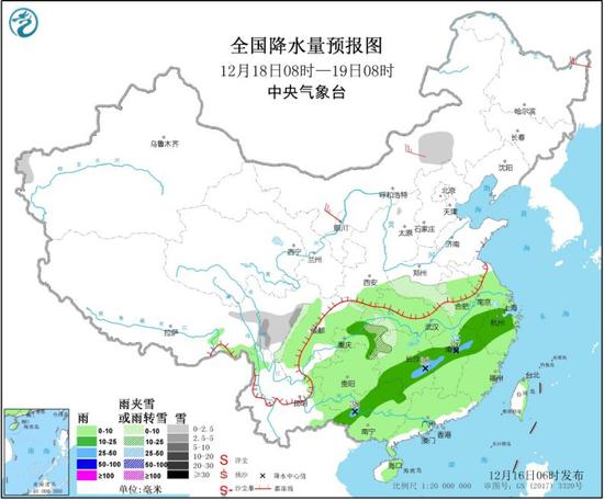 12月17日8时至18日8时,东北地区东部、新疆沿天山地区、西藏东部、青海北部和东部、甘肃河西、西北地区东南部、江汉西部、西南地区北部等地部分地区有小到中雪或雨夹雪,其中,陕西南部、四川东北部、重庆东北部等地部分地区有大到暴雪(10-12毫米)。西藏东南部、黄淮西部、江淮大部、江汉大部、江南大部、西南地区东部、华南大部等地部分地区有小雨,其中,安徽南部、湖北南部、湖南中部、江西北部、浙江北部、四川盆地东北部、重庆东北部和中部、广西东北部等地部分地区有中雨。内蒙古西北部和东部、黑龙江西南部和东北部、辽宁东部、山东半岛、湖北北部等地部分地区有4-5级及以上风。