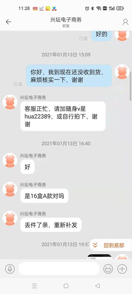 1月13日晚,在平台显示“已收货”之后,曹女士联系名为“兴坛电子商务”的店铺,该卖家回道,“丢件了亲,已经补发了,明天上午给新单号您”。