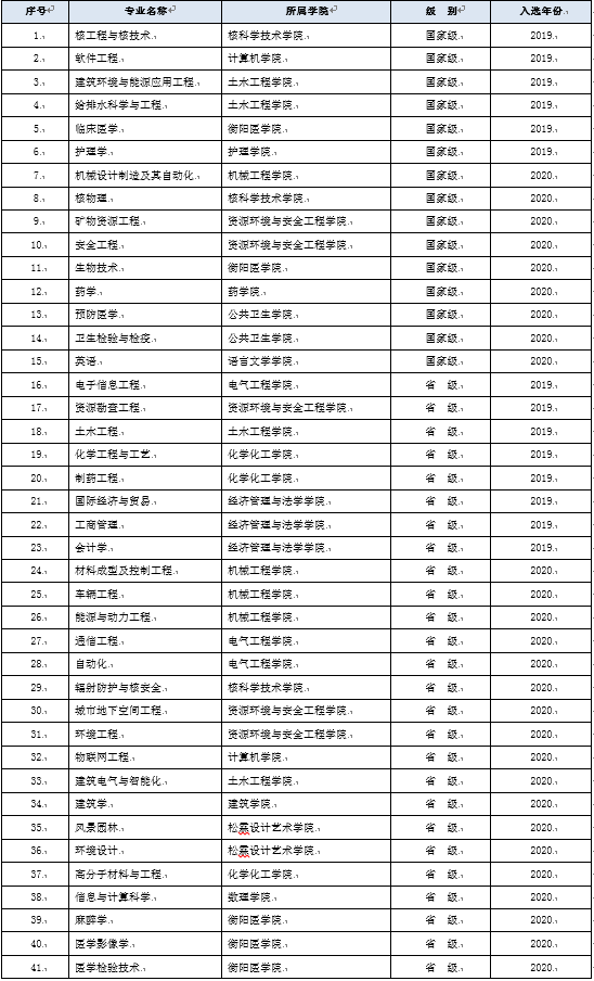 目前,该校拥有国家级一流本科专业建设点15个,省级一流本科专业建设点28个。2018年,为推进“双一流”建设,南华大学印发了《南华大学一流本科专业建设实施方案》《南华大学专业建设标志性指标体系》等文件,2019年获批6个国家级一流本科专业建设点、16个省级一流本科专业建设点。
